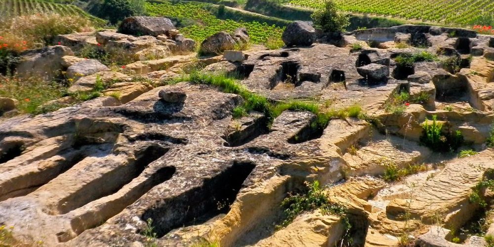 It rises above the road and is made up of 33 graves, the remains of buildings and a cave winepress. We continue towards Rivas, leaving the magnificent Pangua house on the right, now in ruins. The path descends towards the road and leaves the Cella de San Román on the top of a hill. We arrive at Rivas de Tereso and visit its churches. After the urban route, we continue along the road towards Labastida until we take a path on the left that descends towards Las Sepulturas.