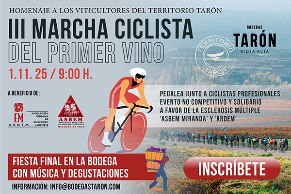 Tras el rotundo éxito de las dos primeras ediciones, Bodegas Tarón presenta la III Marcha Ciclista del Primer Vino. Una jornada deportiva y solidaria que contará con figuras de prestigio del mundo del ciclismo a tiempo que rendirá un merecido homenaje a sus viticultores.